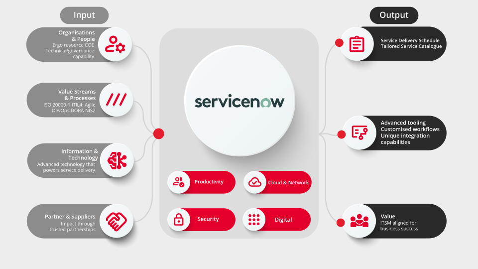 ServiceNow underpins our platform, enabling flexible, tailored solutions that go beyond commoditised service desk offerings—clients benefit from advanced tooling, customisable workflows, and unique integration capabilities.
